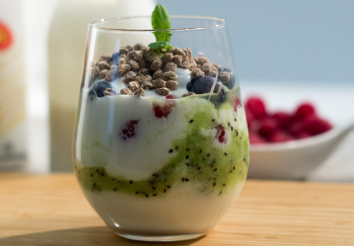 Kiwi obrać i zblendować na mus. W przezroczystym kielichu przekładać na zmia...