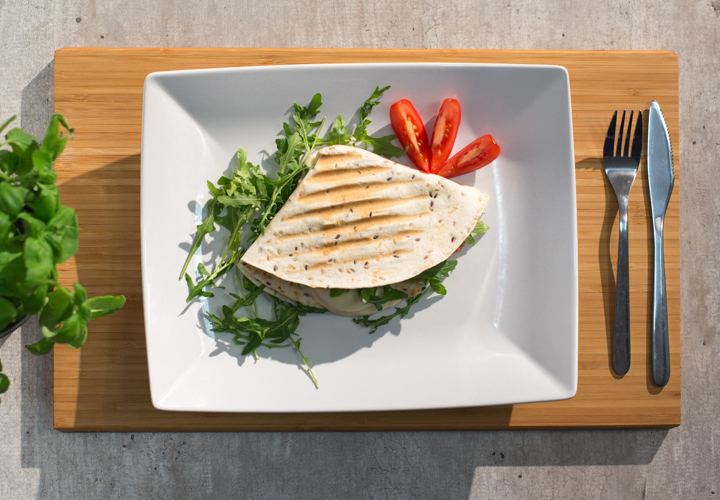 Na placku tortilli ułożyć po kolei: rukolę, pokrojoną w plastry mozzarellę...